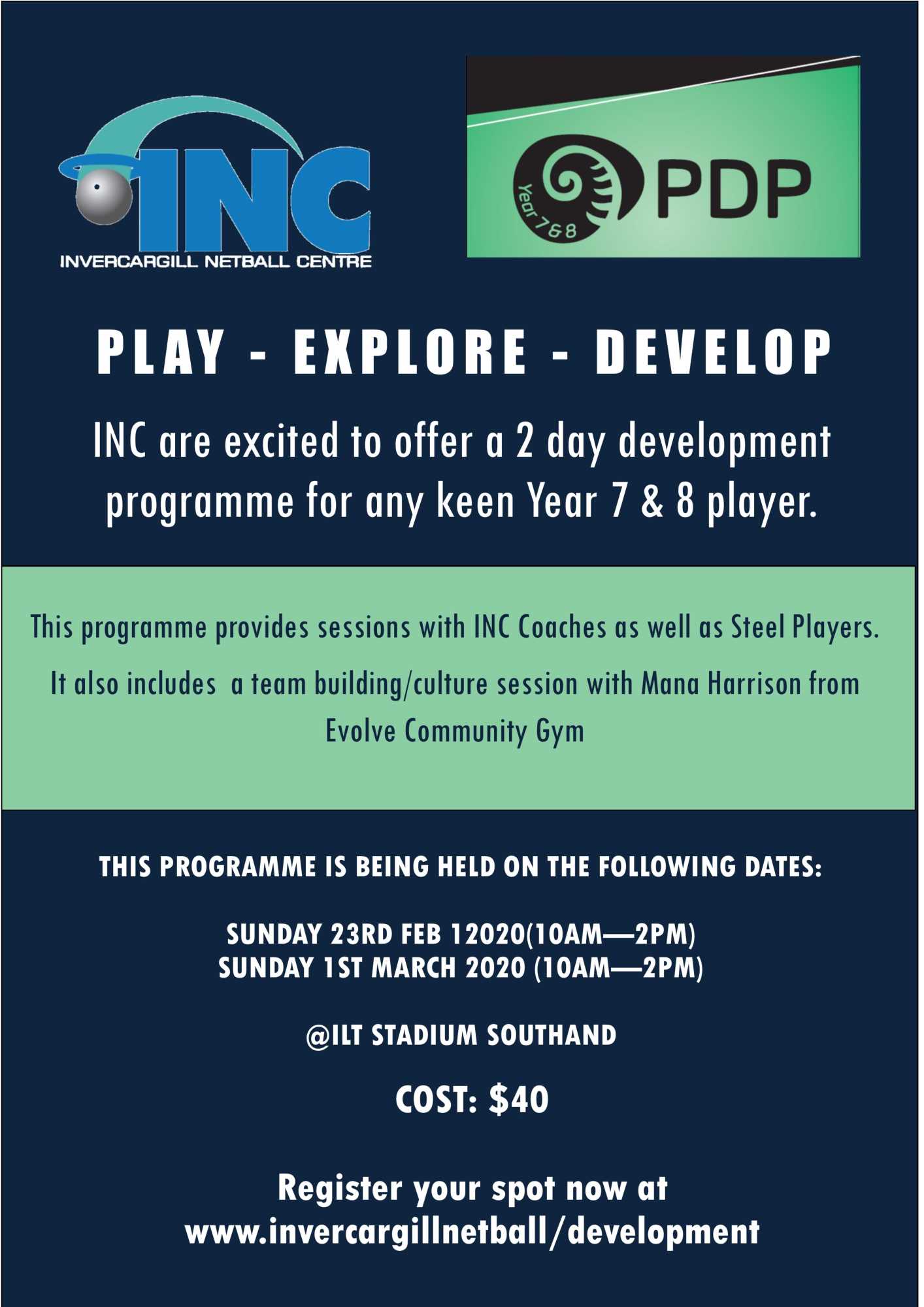 INC are running a Year 7/8 PDP over two Sundays - 23rd February and 1st March 10-2pm at ILT Stadium Southland.